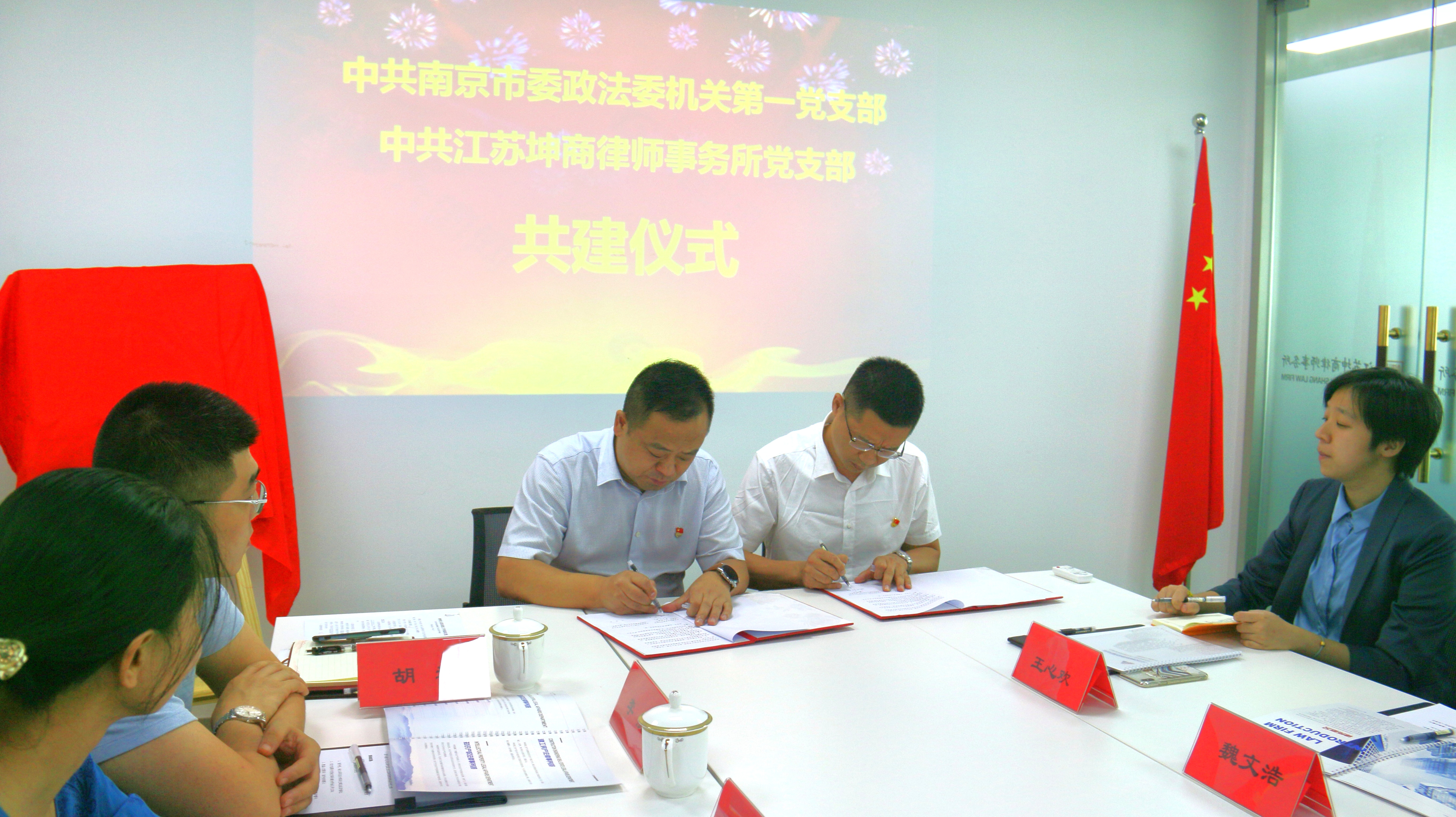 活动开始前,市委政法委机关党委第一党支部部分党员参观了坤商律师事务所党支部“党建园地”,之后,两个支部共同举行了《党支部结对共建协议书》签约仪式,第一党支部向坤商律所党支部赠送了党建学习用书,两支部党员重温了入党誓词,并就组织建设、思想建设、制度建设及共建互动模式等内容进行了深入细致交流。