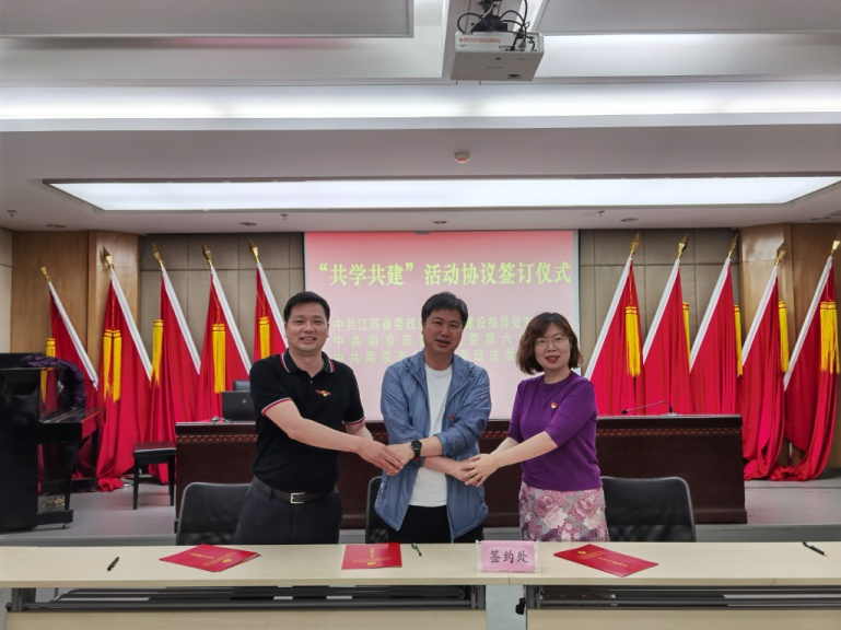 为进一步落实省委、市委政法委“共学共建”活动有关工作要求,建立省市区三级对口支部联学联建工作机制,认真谋划“党史共学、实事共办、发展共谋”工作事项,共办共谋推进政法队伍建设方面的思路和举措,进一步推动党史学习教育走深走实,以务实举措让党员干部受教育、人民群众得实惠、政法事业再提升。6月5日下午,江苏省委政法委队伍建设指导处党支部、南京市委政法委第六党支部、建邺区委政法委党支部一行16人,前往建邺区兴隆街道奥体社区党委,开展省、市、区委政法委党组织“共学共建”协议签订活动。江苏省委政法委二级巡视员邵淑娟,南京市委政法委政治部主任印文华,建邺区委常委、政法委书记杨晨出席。